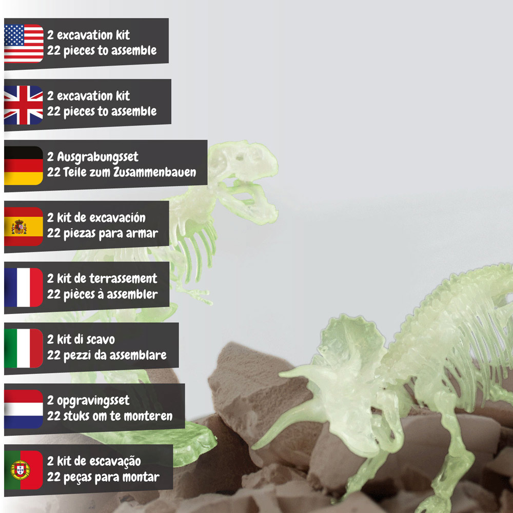 - Este Kit de escavação 2 em 1 proporciona, escavar e montar dois fósseis dos teus dinossauros favoritos – T-rex e Triceratops – que brilham no escuro.
