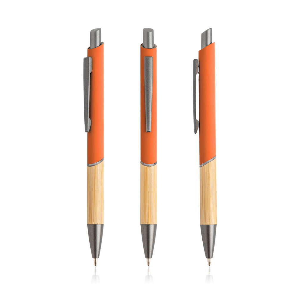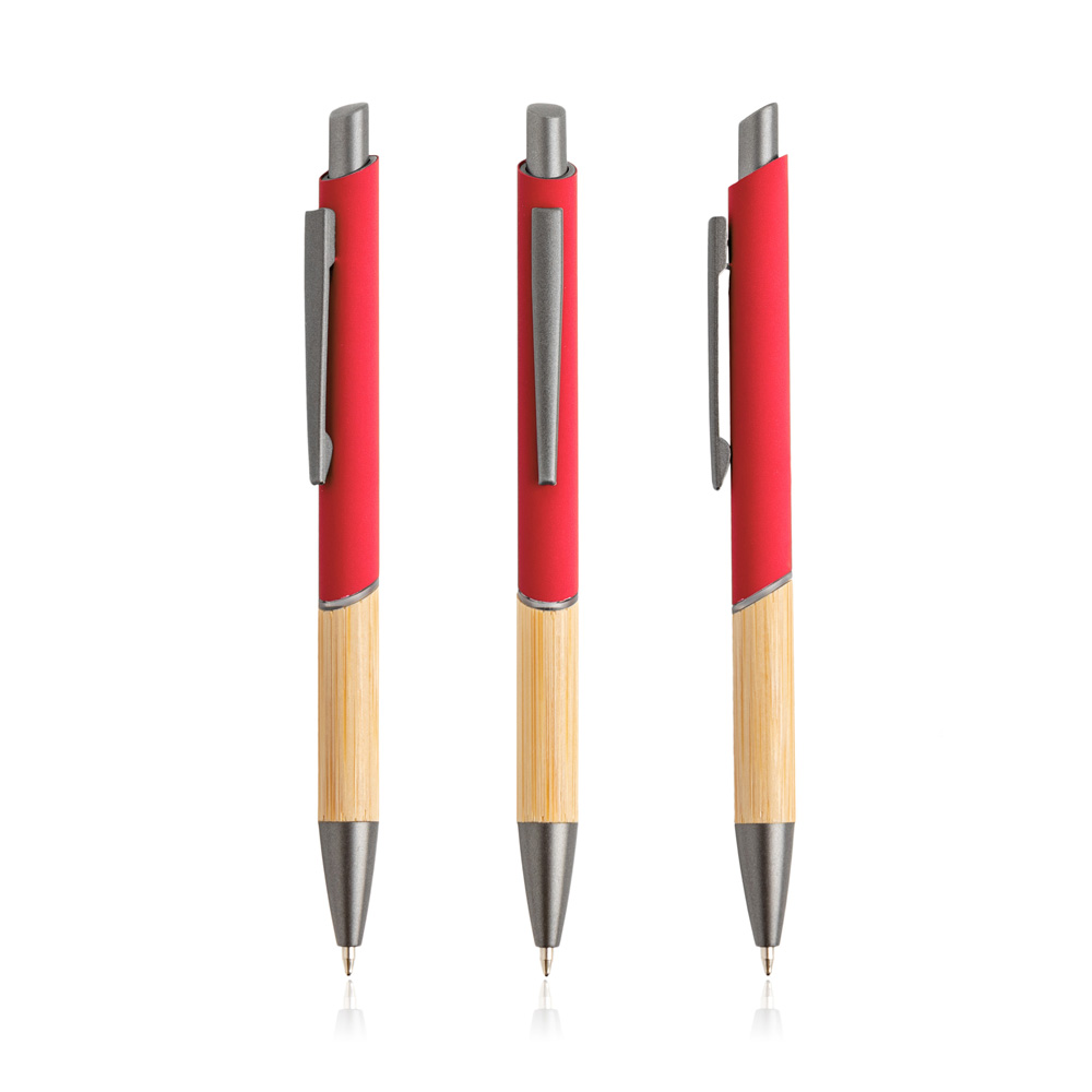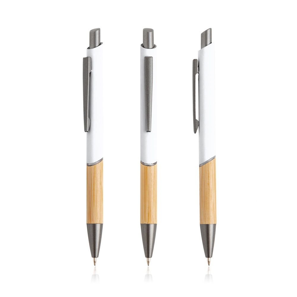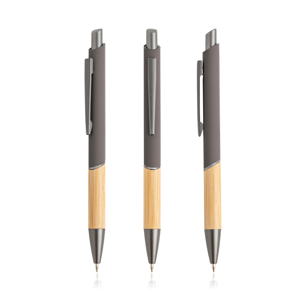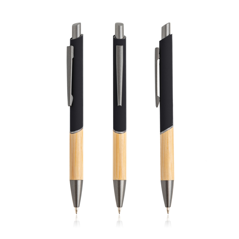 - Esta esferográfica de escrita azul tem um design moderno, cruzando o metal reciclado com toque de borracha com a natureza do bambu.